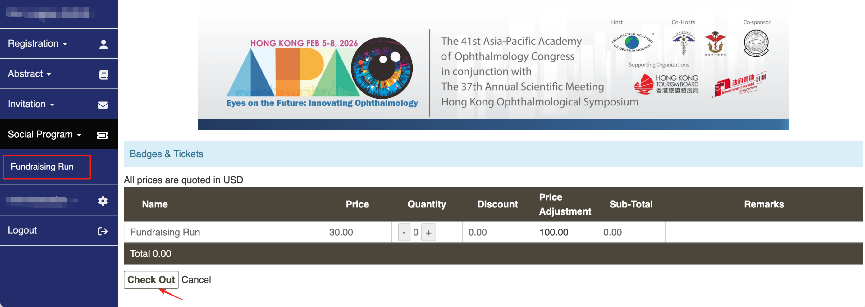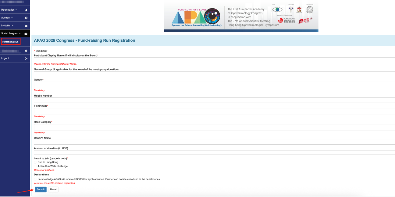 - Log in to the congress system. Select “Fundraising Run” under the “Social Program” section on the left sidebar of your account main page.