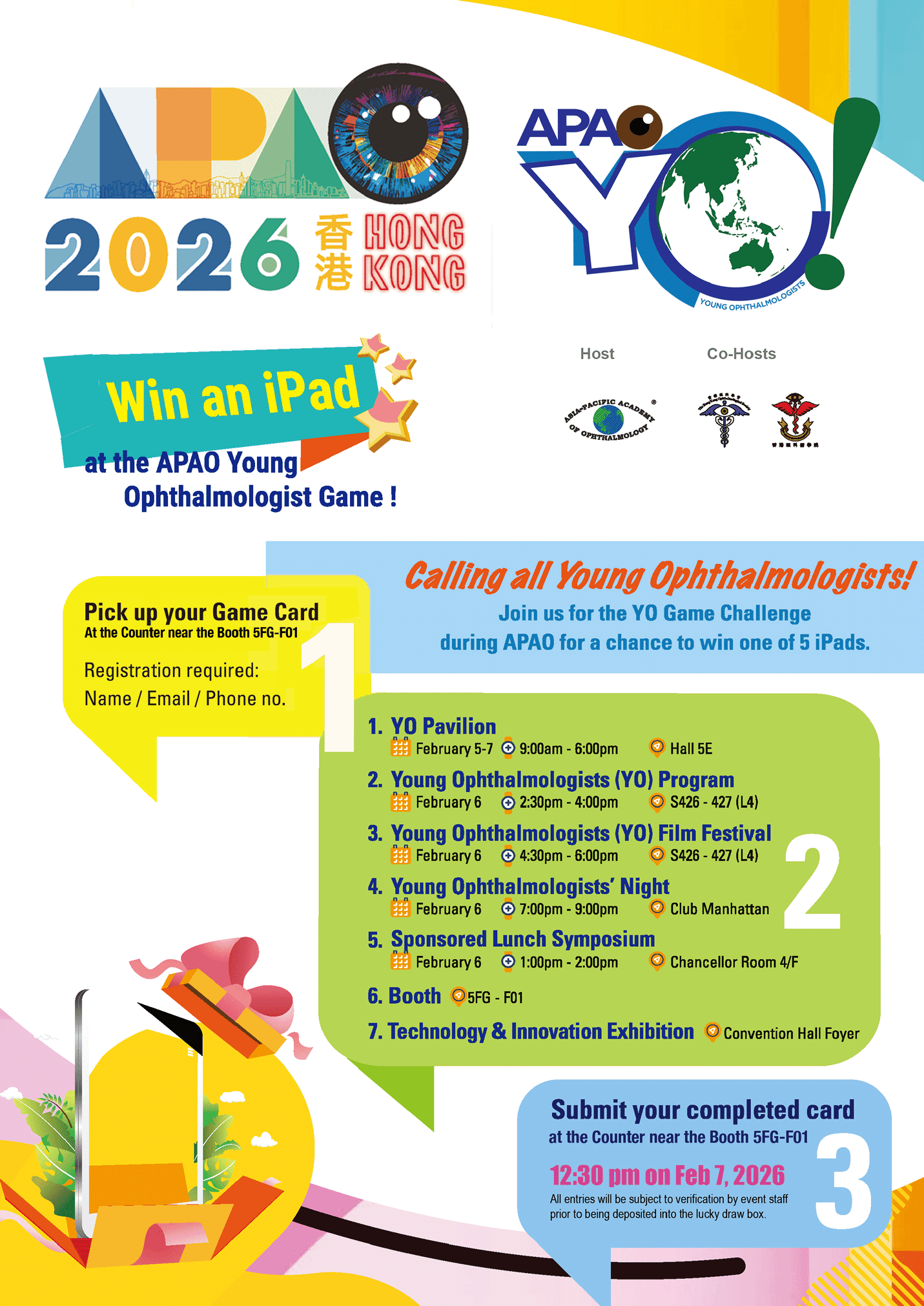 Young Ophthalmologists (YO) activities during APAO 2026 (Feb 5 – 8, 2026) at the Hong Kong Convention and Exhibition Centre (HKCEC), Hong Kong, China.